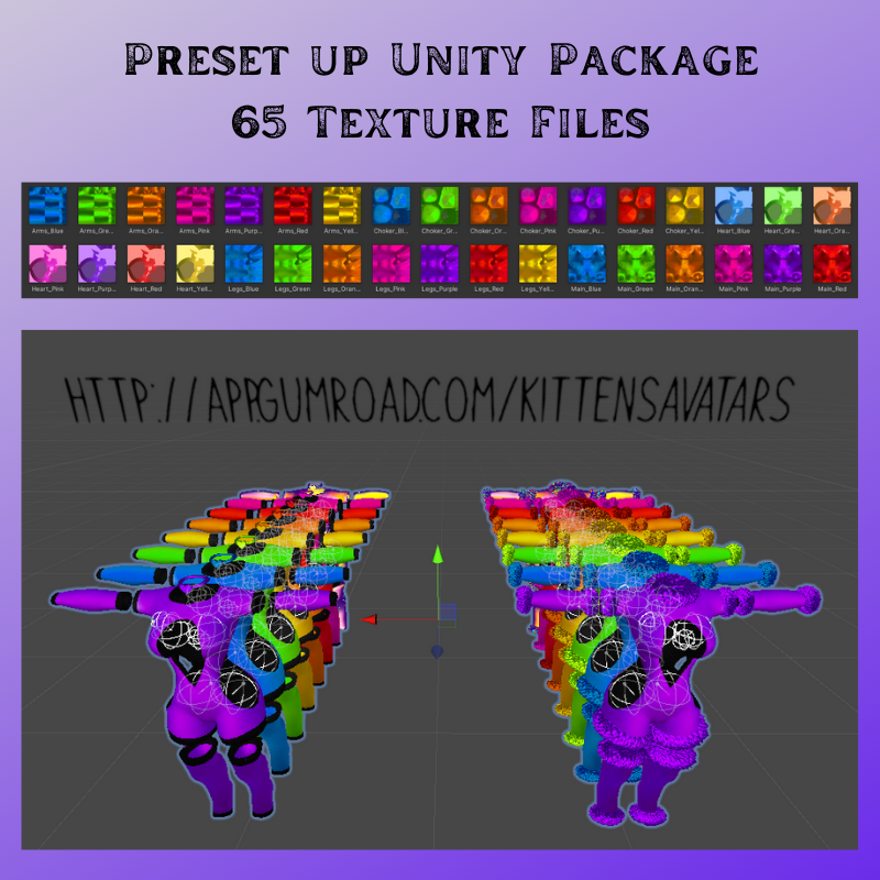- 2 .FBX file (each with shapekeys and 9 separate mesh parts for customizability) and 65 .PNG texture files including UVMaps.