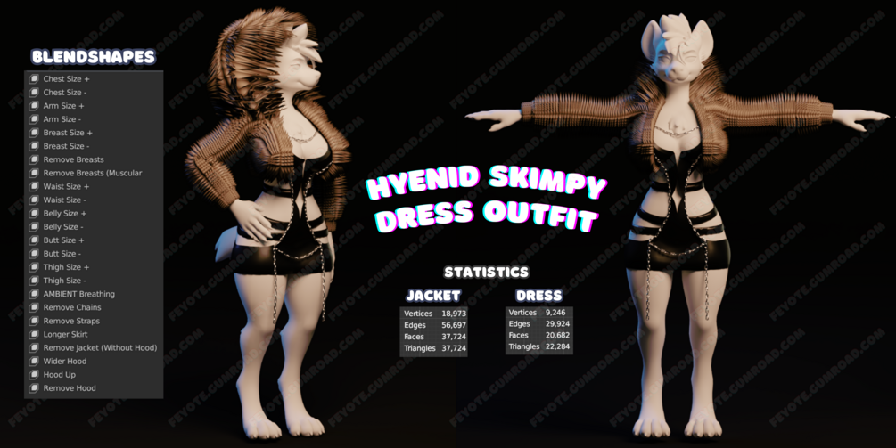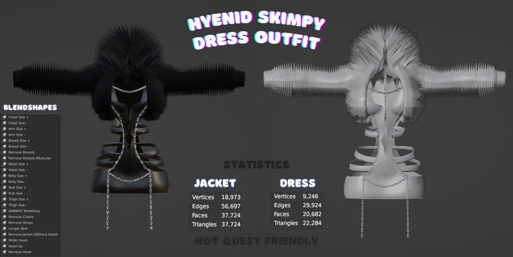 - 20+ blendshapes. (Remove Chains, Remove Straps, Hood up, Hood down, remove Hood blendshapes, Longer Skirt, included.)